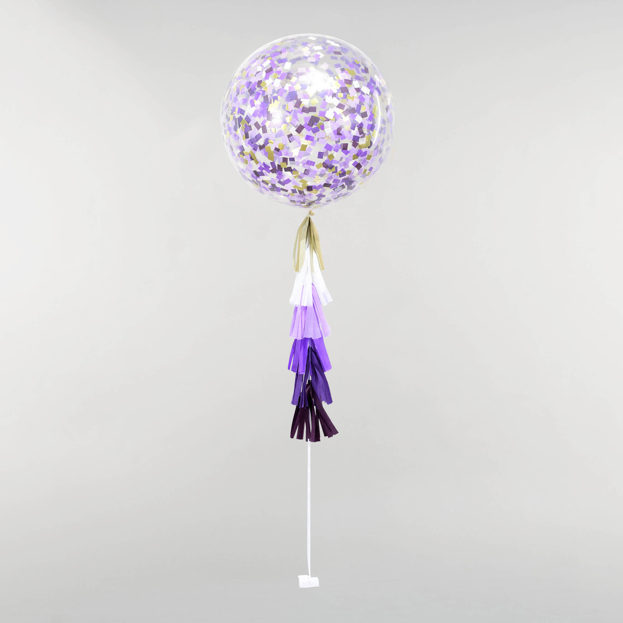 - (1) 36″ Clear Balloon with Purple, White and Gold Confetti and Helium