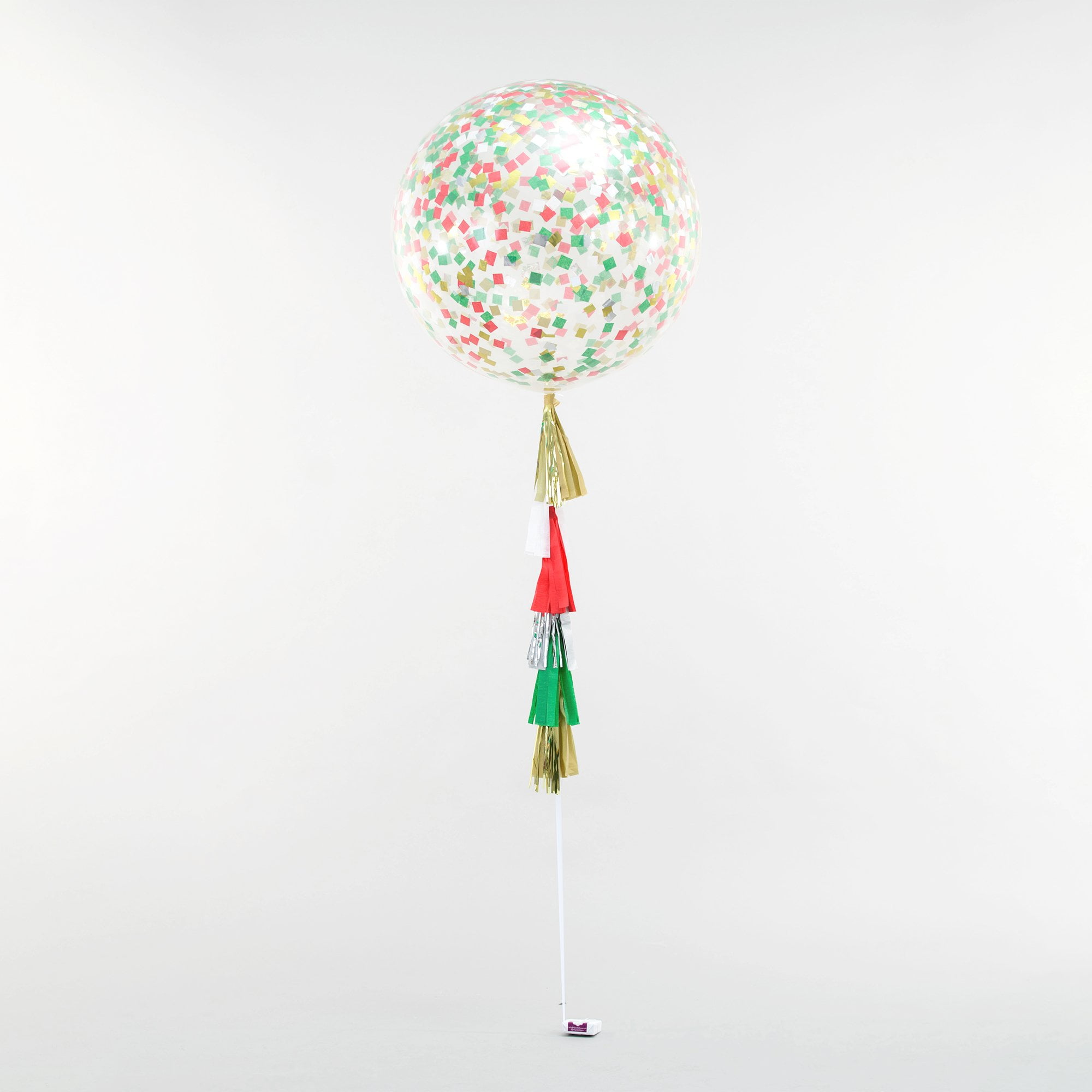 - (1) 36″ Clear Balloon with Gold, White, Red and Green Confetti and Helium