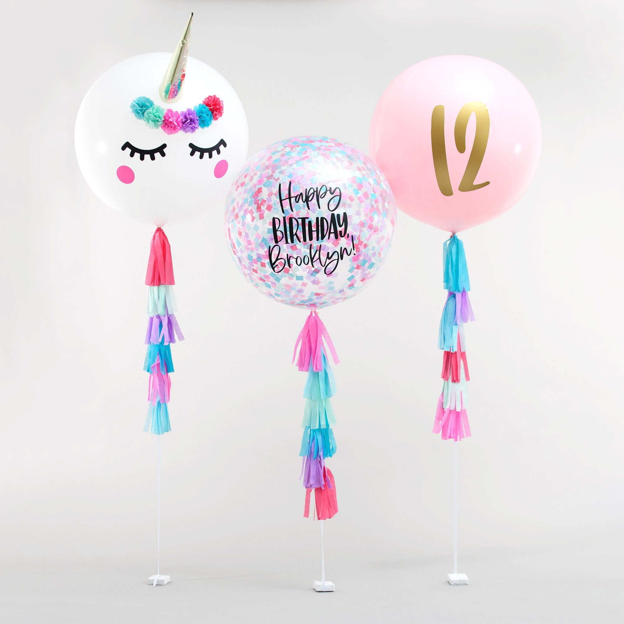 This Big Ass Balloon (BAB) Package includes one beautiful balloon, one handmade and fully assembled tassel, vinyl unicorn face, horn, flowers, and a weight: